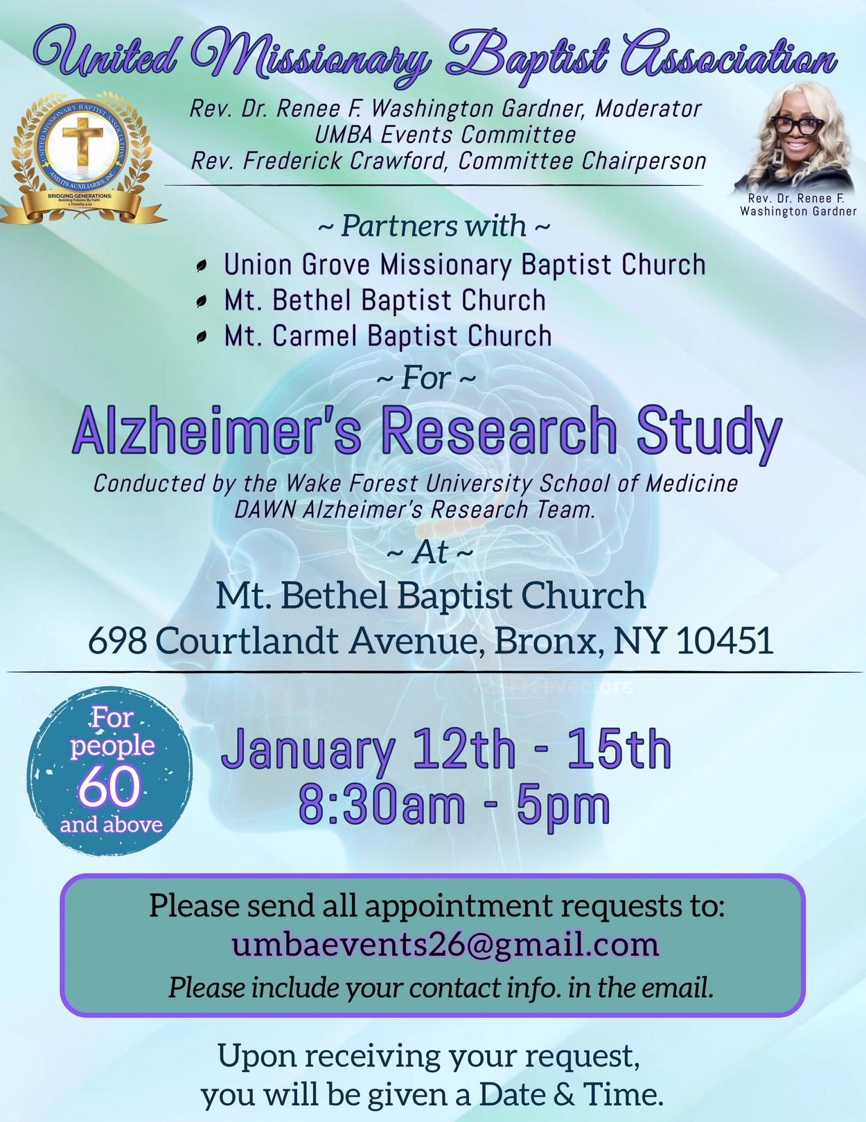 Please join us for an Alzheimer’s Research Study for people ages 60 and older, January 12–15 at Mt. Bethel Baptist Church.